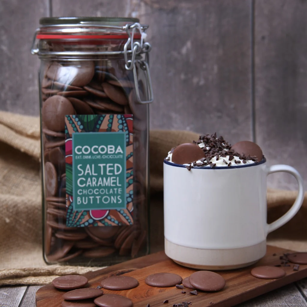 A huge clip lid glass jar filled to bursting with 950g of our delicious giant Belgian salted caramel milk chocolate buttons. This is a great option for sharing or gifting, and can be used for storing all sorts of things after the chocolates have gone!