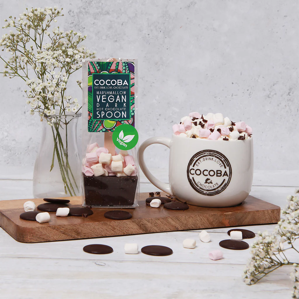 A 45g block of 55% dark chocolate on a wooden spoon, with vegan mini marshmallows, for the ultimate vegan, vegetarian, Halal friendly, gelatine free, lactose free but delicious Cocoba hot chocolate at home!